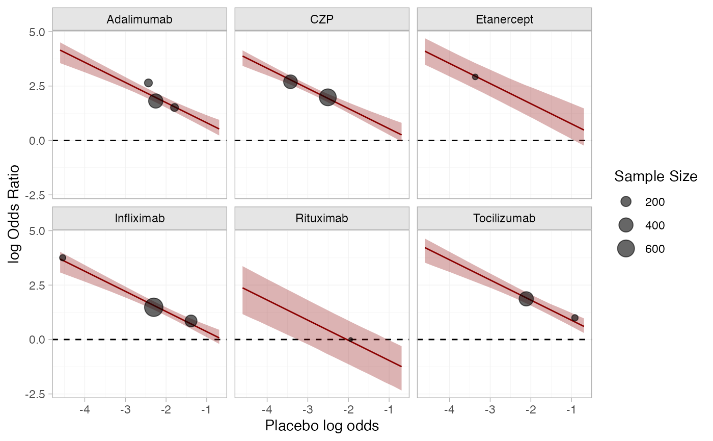 labs(x = "Placebo log odds", y = "log Odds Ratio", size = "Sample Size") +